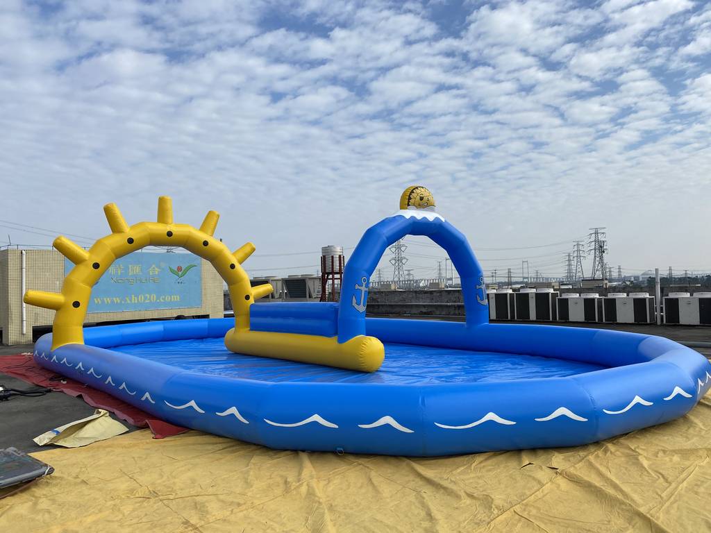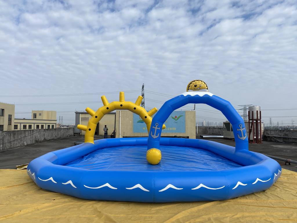 充气蓝黄游泳池,选用加厚环保 PVC,安全防漏、抗撕裂。造型童趣,集成太阳、拱门装饰,适配家庭、亲子营地等场景。快速充气即可打造嬉水空间,支持定制尺寸,为孩子开启安全有趣的水上欢乐时光 。