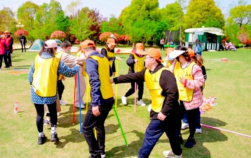 比赛以团队为单位参与,每队成员手持一根充气柱体站立成一列。比赛开始时,队员需同步松开手中柱体,迅速抓住前一位队员的柱体,在保持所有柱体不落地的前提下,以团队协作方式完成柱体转动。成功标准为:团队在柱体不掉地的情况下完成 10 次整体转动,或在限定时间内完成最多次数的柱体移动,移动次数最多的团队得分最高。