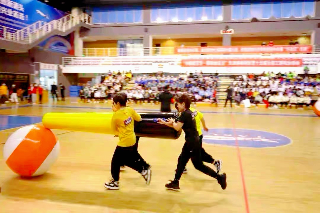 每队8名队员,分两组,每组4人在起点处抱柱子,裁判发令后通过团队协作一起用一个充气柱子将大球推动向前,抵达终点然后换下一个接力小分队,接力赛总用时最短的小组名次前列。