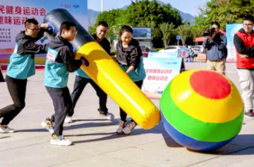 每队8名队员,分两组,每组4人在起点处抱柱子,裁判发令后通过团队协作一起用一个充气柱子将大球推动向前,抵达终点然后换下一个接力小分队,接力赛总用时最短的小组名次前列。